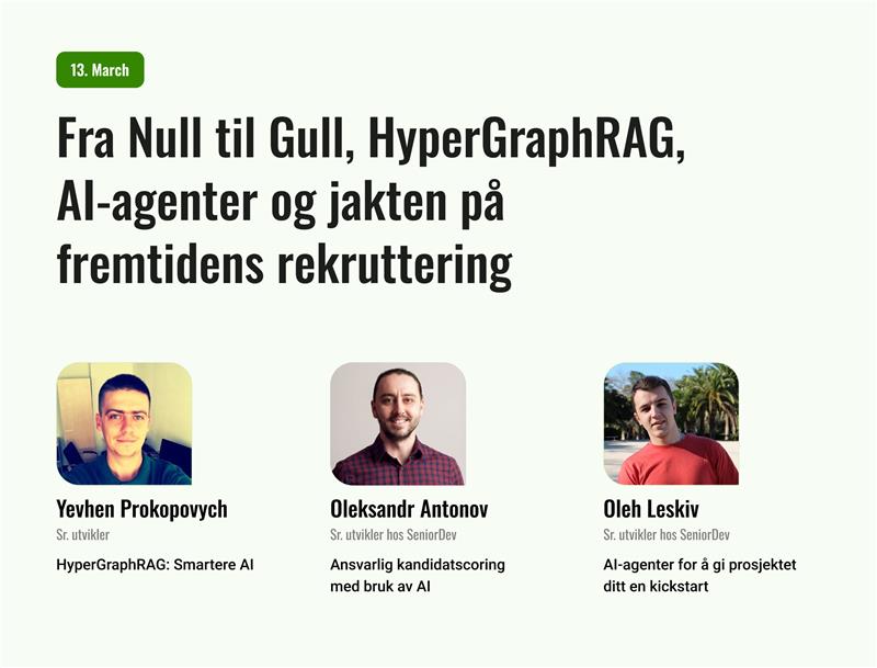 Oleh Leskiv, sr. utvikler hos SeniorDev, har vært på ballen med KI-verktøyene siden ChatGPT ble lansert, og dette vil bli en praktisk live-demo av hvordan man øker produktiviteten og redusere tiden brukt på rutinemessige programmeringsoppgaver.